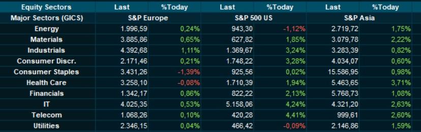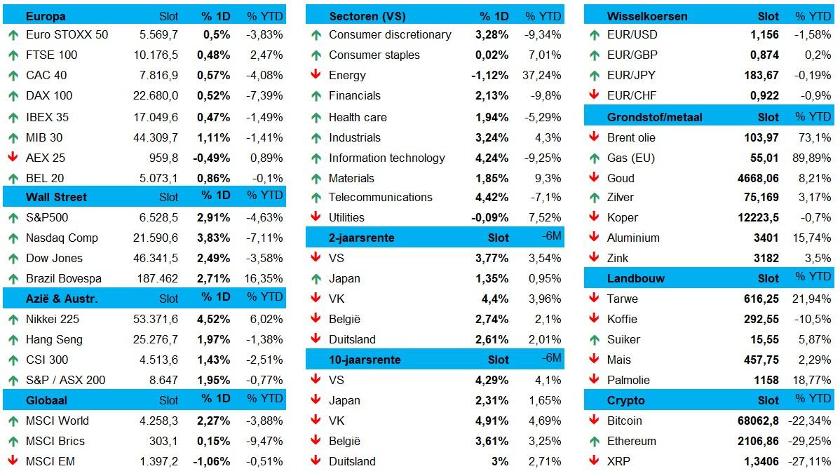 De hoop op een de-escalatie leverde ook voor aandelen een topdag op. De Euro Stoxx 600 klokte af op een winst van +0,4%, maar dat cijfer is een onderschatting omdat Trump pas na het slot zijn mededeling lanceerde. Wall Street kende een krachtigere rally, met 2,9% winst voor de S&P500 en 3,2% voor de Nasdaq. Enkel energie (-1,1%) en nutsbedrijven (-0,1%) verloren terrein op Wall Street, maar grondstoffen (+1,5%), Industrials (+3,2%) en discretionaire consumentengoederen (+3,3%) waren in topvorm, met IT (+4,2% ) en telecom (+4%) als uitblinkers.