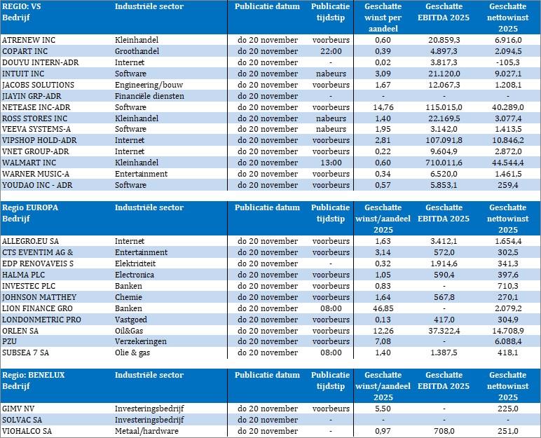 Bedrijfsresultaten komen er vandaag van Allegro, AtRenew, Copart, CTS Eventim, Douyu International, EDP Renováveis, Gimv, Halma, Intuit, Investec, Jacobs Solutions, Jaiyin Group, Johnson Matthey, Lion Finance, LondonMetric Property, NetEase, PZU, Ross Stores, Subsea 7, Veeco Systems, Vnet Group, Vohalco, Vipshop Holding, Walmart, Warner Music en Youdao.