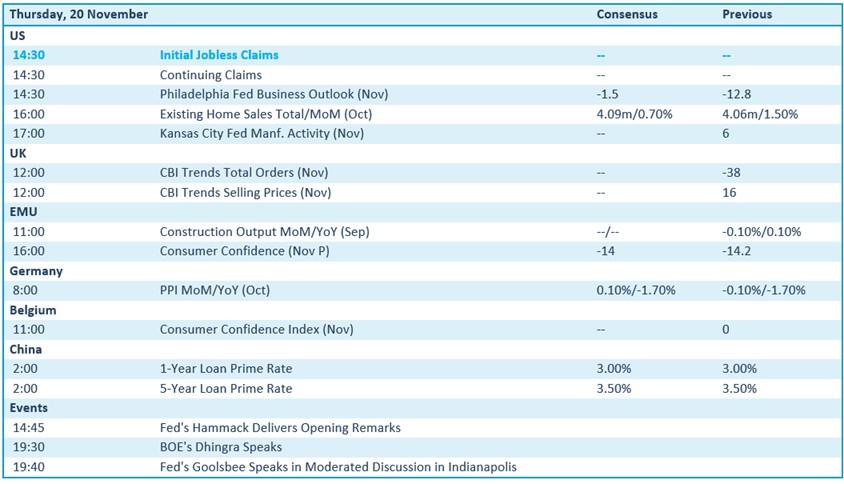 Op de “klassieke” economische kalender prijken de nieuwe wekelijkse werkloosheidsuitkeringen, de Philadelphia Fed Business index en de woningverkopen. Het VK publiceert CBI-orders en verkoopprijzen, terwijl de eurozone met bouwproductie en consumentenvertrouwen op de proppen komt en Duitsland een update van de producentenprijzen rapporteert. België geeft consumentenvertrouwen vrij, terwijl China de leidinggevende basisrentes (op 1 en 5 jaar) zal updaten.
