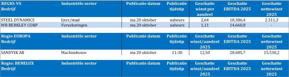 Bedrijfsresultaten zijn er ook niet veel. Stilte voor de storm, heet dat dan, met slechts een handvol namen waaronder Steel Dynamics, WR Berkley en Sandvik.