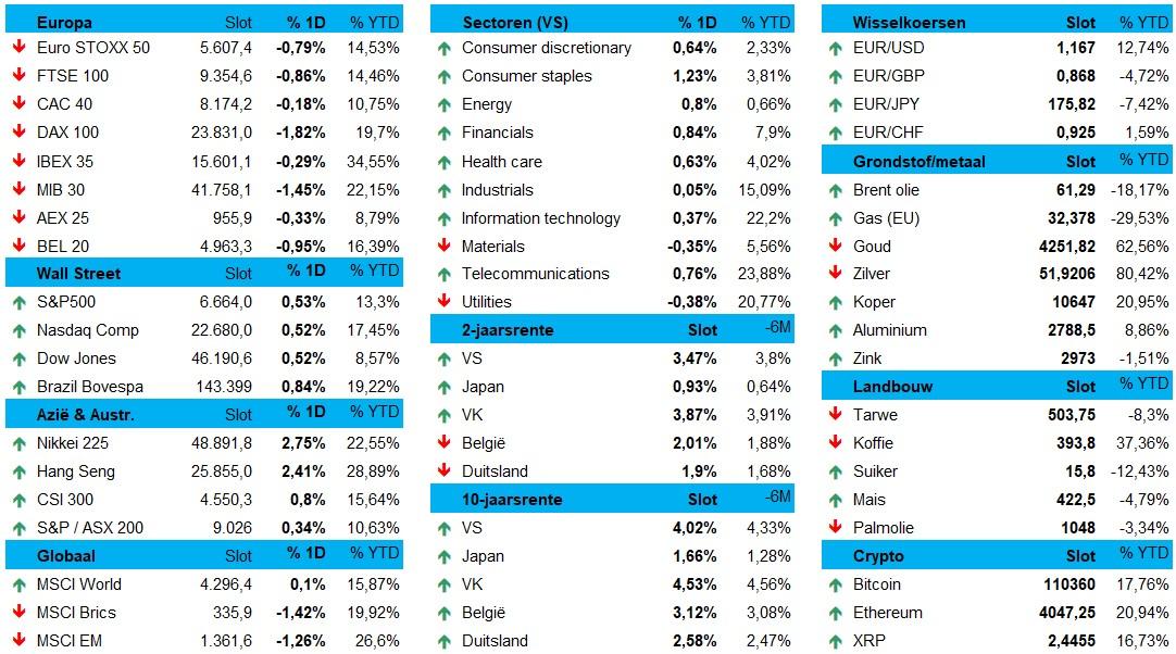 De dollar stabiliseerde tegenover de euro (€1 = $1,1666) en de Japanse yen ($1 = 149,46 JPY), terwijl de euro ook niet bewoog tegenover de Yen (€1 = 175,64 JPY). Wel bleef de vraag naar goud erg hoog, waardoor de koers 6% aantrok doorheen heel vorige week, maar van die winsten iets moest teruggeven tot 4.232 dollar per ounce. De olieprijzen, tot slot, bleven een overvloedig aanbod van de OPEC+ vertalen in zwakte. Voor een Brent-vat betaalt u ‘nog maar’ 60,77 dollar.