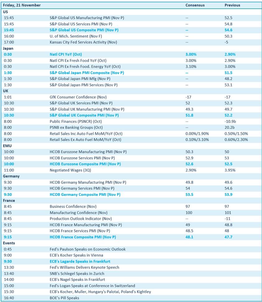 Vandaag staan er belangrijke PMI-sentimentsdata op het menu en die komen van zowat overal ter wereld: de VS, het VK, Japan, Duitsland, Frankrijk, de Eurozone. Verder krijgen we uit de VS en het VK een update van het consumentenvertrouwen, terwijl Japan inzicht geeft in de inflatiecijfers. Het VK brengt verder nog wat inzicht in de detailhandelsverkopen aan, terwijl Frankrijk een rist vertrouwensindicatoren vrijgeeft. Tot slot spreken centrale bankiers van de Fed, ECB, SNB en BOE op diverse evenementen.