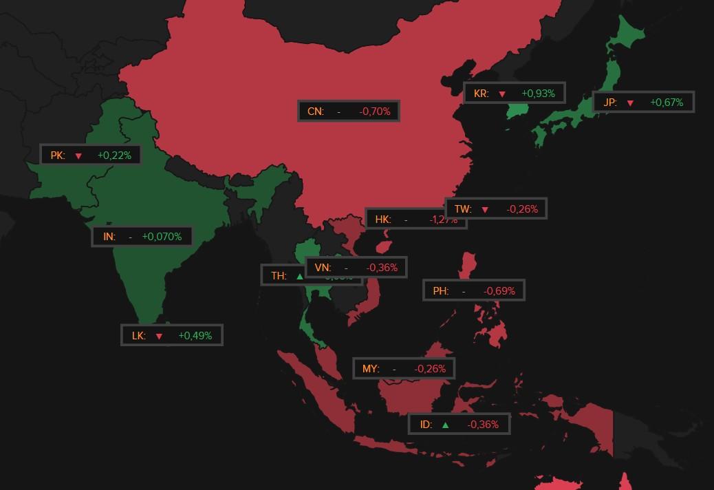De Aziatische markten wisselden vannacht rood met groen, onder druk van de zwakke Japanse export, maar gesteund door politieke verschuivingen in Tokio. Japan (+0,7%) gaat immers door op het (nieuwe) politieke elan, want kersvers premier Sanae Takaichi zou werken aan een stimuleringspakket van meer 100 miljard dollar. Technologie ontspant doorheen de hele regio, met Hongkong op 1,3% verlies en de HS Tech ondex op 2,1% verlies (met grote verliezers zoals Alibaba (-2,9%), Baidu (-2,9%) en Netease (-5,5%).