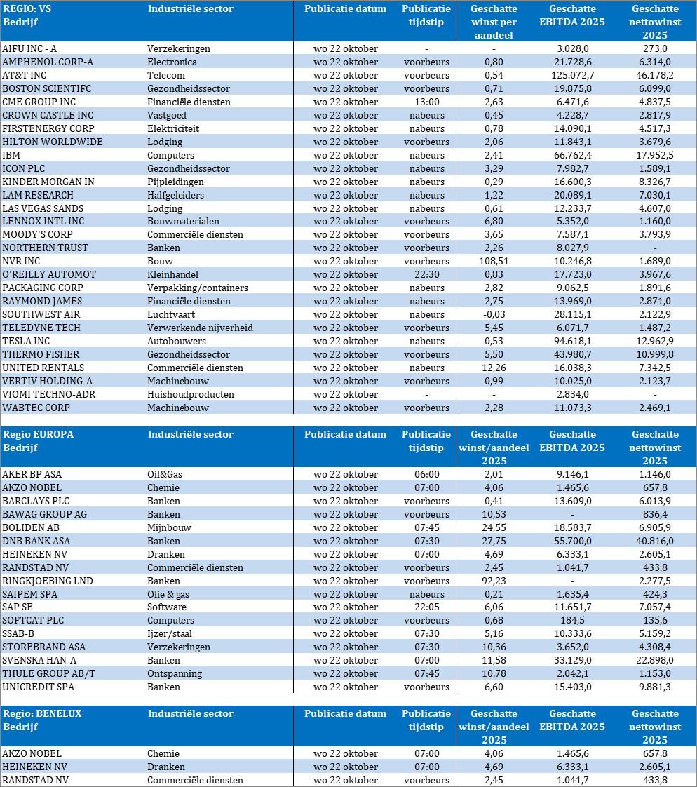 Er zijn vandaag wel een héél pak bedrijfsresultaten, waaronder Aifu, Amphenol, AT&T, Boston Scientific, CME, Crown Castle, First Energy, Hilton Worldwide, IBM, Kinder Morgan, Lam Research, Las Vega Sands, Lennox, Moodys, Northern Trust, Oreilly Automotive, Packaging, Raymond James, Southwest Airlines, Teledyne, Tesla, Thermo Fisher, United Rentals, Vertiv Holding, Viomi Technology, Wabtec, AkerBP, Akzo Nobel, Barclays, Bawag, Boliden, DNB Bank, Heineken, Saipem, SAP, Softcat, SSAB, Storebrand, Svenska Handelsbanken, Thule, Unicredit, Randstad en nog wat meer. Smullen maar!