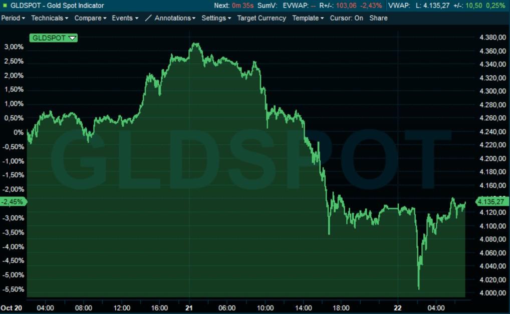 Opvallend was een scherpe uitverkoop van goud, wat de volatiliteit op de bredere markt ietwat versterkte. De goudprijs klokte na een wilde dag 5,5% lager af op 4.129 dollar per ounce, de grootste dag daling sinds 2013. Dat werd volgens “de media” uitgelokt door winstnemingen (dat lijkt logisch, ja), een sterkere dollar (maar die zagen we vannacht niet tot amper dalen, want €1 = $1,1606) en schijnbaar ook een afnemende vraag vanuit India (niet dat dat in enkele uren tot massale verkoopdruk moet leiden). De conclusie is dat de goudprijs lager staat en daarmee zijn niveau bereikt van .. vorige week. Geen nood voor drama, toch?
