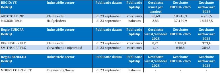 Bedrijfsresultaten komen er onder meer van Autozone, Micron Technology, Kingfisher, Smiths Group en Moury Construct.