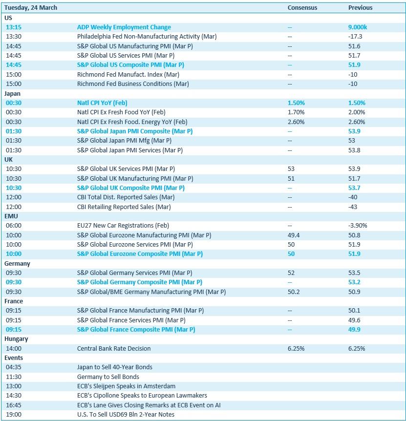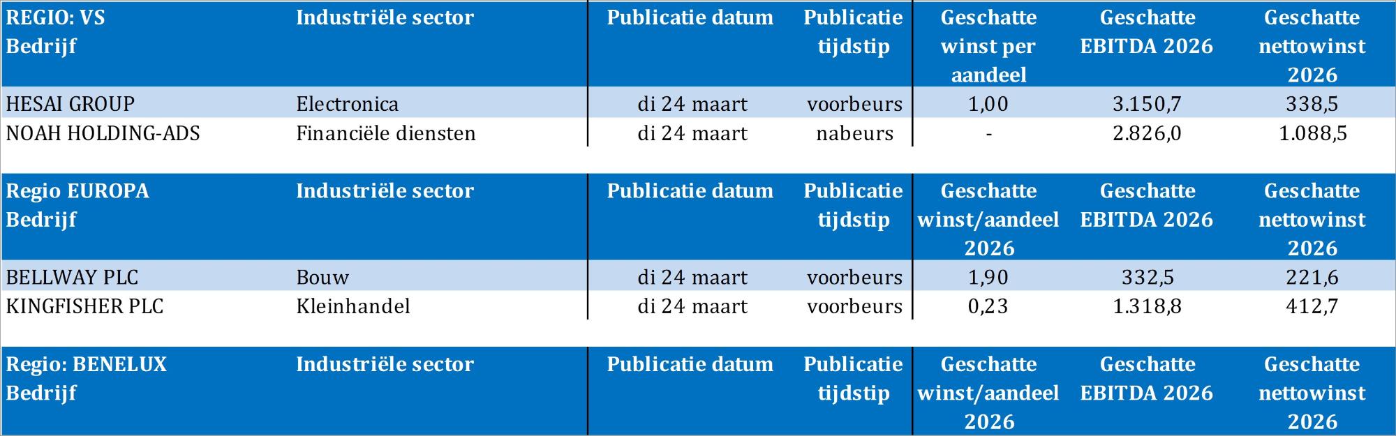 Op de economische kalender vinden we de belangrijke maandelijkse update van de PMI-sentimentsindicatoren, voor de VS, Europa, Japan, Frankrijk, Duitsland en het VK. Die zijn erg belangrijk, gelet op de impact van de oorlog in Iran. Verder levert de VS inzicht in het sentiment in en rond Richmond en Philadelphia. Japan publiceerde inflatiecijfers en het VK geeft inzicht in de kleinhandel, terwijl ook Europese autoverkopen nogal belangrijk zijn voor alles wat met automotive te maken heeft. Bedrijfsresultaten komen er vandaag van Bellway, Hesai, Kingfisher en Noah.