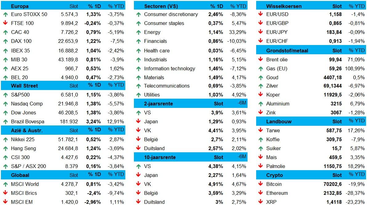 De Europese beurzen gingen met duidelijke winst de dag uit. De Euro Stoxx 600 won 0,6%, de AEX 0,5%, de BEL20 +0,6% en de DAX zelfs +1,2% en de CAC40 ging +1,15% vooruit. Ook Wall Street herstelde netjes, met 1,4% winst voor de Dow Jones en de Nasdaq, terwijl de S&P 500 1,15%hoger koerste. Op de valutamarkten herstelde de euro tegenover de dollar (€1 = $1,1605), terwijl de yen verzwakte ($1 = JPY 158,53). De goudprijs zakte na een erg zwakke vrijdag nog eens met 0,3% tot 4.404 dollar en zilver verloor 0,5% tot 69.34 dollar per ounce. Op de cryptomarkt hield de lethargie aan, met Bitcoin (70.846 dollar) en ether (2.152 dollar) ongewijzigd.