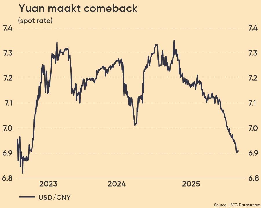 Op de valutamarkten was er op het eerste zicht weinig animo. De dollar trappelde alweer ter plaatse tegenover de euro (€1 = $1, 1801) en het Britse pond (£1= $ 1,352). Veel interessanter is de evolutie van de Chinese yuan op langere termijn. De munt tikte gisteren het sterkste niveau aan tegenover de dollar in bijna drie jaar, ondersteund door de tariefturbulentie én extra instroom van buitenlandse valuta dankzij China's recordoverschot op de lopende rekening in het vierde kwartaal. De yuan noteert nu aan 6,8975 per dollar.