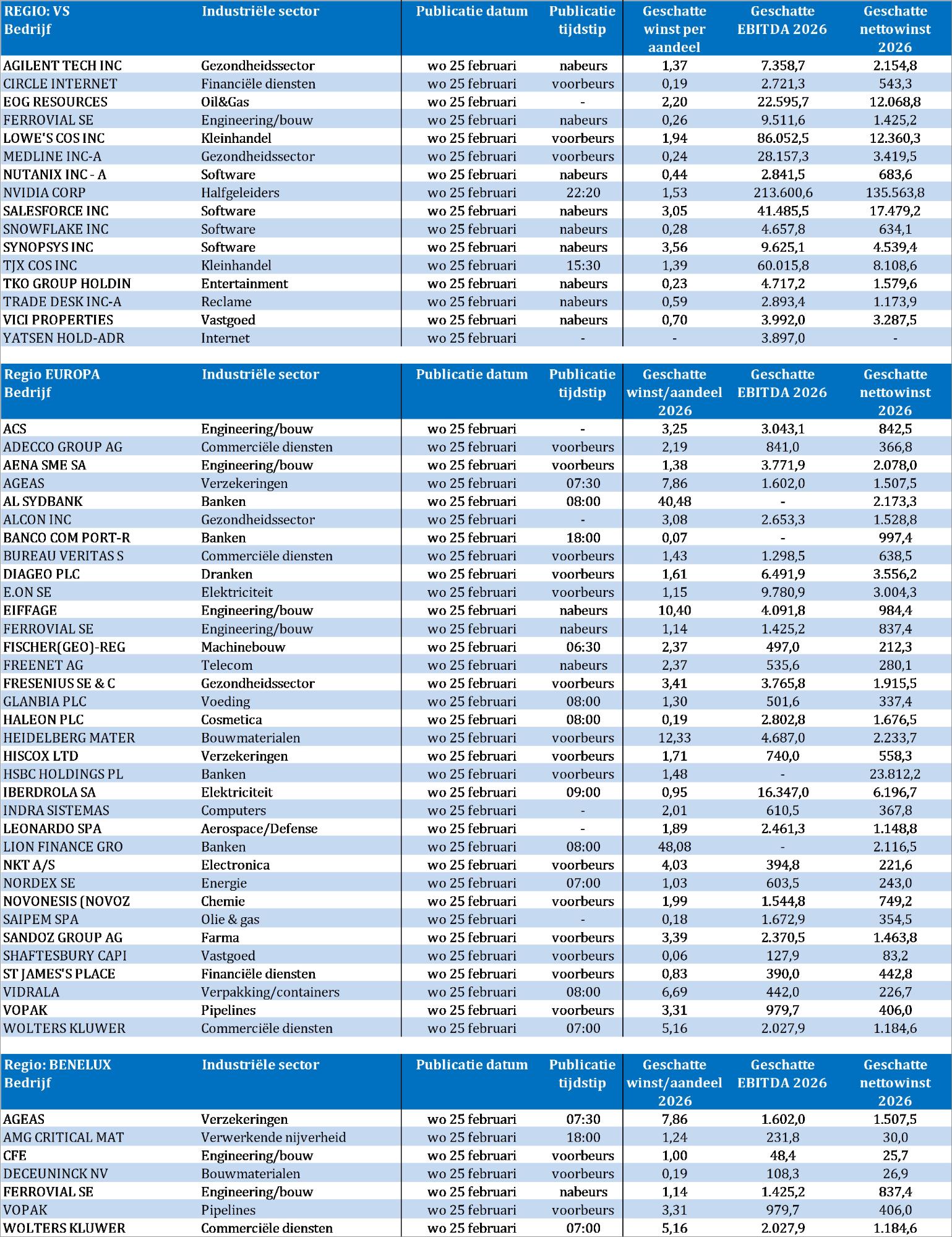 Er staan wél een pak interessante bedrijfsresultaten op het menu, waaronder deze exemplaren: NVIDIA, Salesforce, Adecco, Ageas, AMG Critical Materials, CFE, Deceuninck, Diageo, Eiffage, Fresenius, Georg Fischer, HSBC, Iberdrola, Nordex, Novozymes, Snowflake, The Trade Desk, Vici Properties, Vopak en Wolters Kluwer. Bekijk zeker de volledige kalender voor meer bedrijfsnamen.