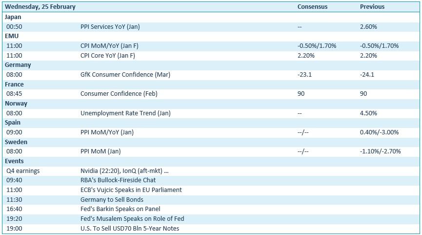 De economische kalender omvat een een mix van inflatie‑ en vertrouwensindicatoren uit verschillende economieën. In Japan kregen we al info over de prijsontwikkeling in de dienstensector, terwijl enkele Europese landen straks met algemene en kerninflatiedata aan komen draven over januari. Duitsland en Frankrijk leveren data over het consumentenvertrouwen aan.