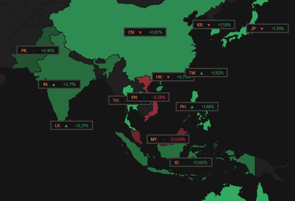 Azië volgde vannacht het groene Wall Street (S&P 500 +0,8%, Nasdaq +1,1%), met alweer winst voor Zuid-Korea (+1,6%), Japan (+1,4%) en Taiwan (+1,9%). Heropleving van tech (of dehyping van AI-vrees?) in het zog van blijvende sterkte voor chipgerelateerde bedrijven, waaronder Samsung, SK Hynix en Taiwanese spelers. Die blijven namelijk profiteren van stijgende investeringen in AI‑infrastructuur en datacenters, gisteren nog door Meta en AMD. Het algemene positieve sentiment hielp ook China (+0,9%) en zelfs India (+0,7%) hoger in een beweging waar de recente tarievensoap wind in de zeilen blijft blazen.