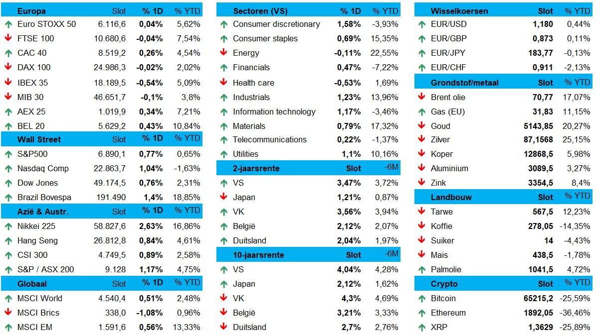 Op de brede markt noteren we een kleine daling voor de olieprijs (tot 71,17 dollar per Brent-vat), terwijl de recente turbulentie goud (+1,23% tot 5.195,25 dollar per ounce) en zilver (+3,42% tot 90,07 dollar) vleugels blijft geven. Niet zo voor de cryptomunten. De Bitcoin daalde eerst tot 62.645 dollar, maar herstelde nadien tot 65.409,60 dollar. Zelfde voor Ether, dat afklokte op 1.904,96 dollar.