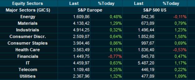 Op sectorniveau fietsten grondstoffen en nutsbedrijven met meer dan 1% winst vooraan in het Europese peloton, terwijl ook de consumentenbedrijven, IT, energie, industrials en telecom hoger afklokten. Niet dat er enkel winnaars waren, want de financials (-0,8%) verloren als enige pluimen.
