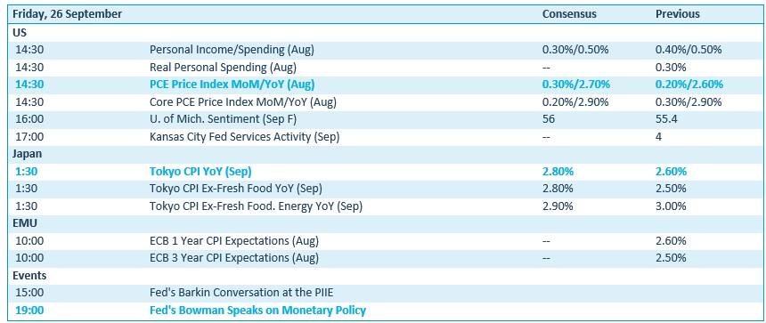 Het is vandaag nog eens een quasi zuivere inflatiedag. De Amerikaanse PCE prijsindex staat met grote stip aangevinkt, en daar horen natuurlijk verwachtingen bij: de levensduurte volgens de favoriete graadmeter van de Fed kan 2,7% aangedikt zijn op jaarbasis. Ek cijfer dat afwijkt zal door de obligatiemarkten vertaald worden in een bijstelling van de renteverwachtingen. Verder levert de VS een inzicht in de persoonlijke inkomens en een van de sentimentsindex van de universiteit van Michigan en de Federal Reserve bank van Kansas aan.