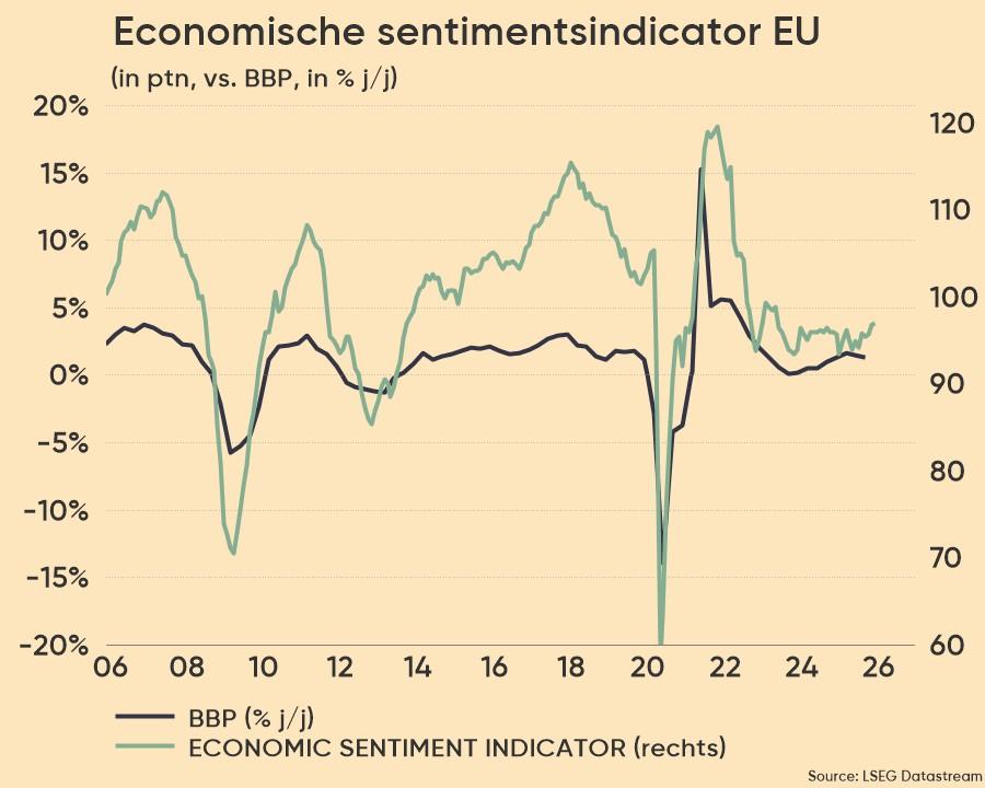Ook bleek gisteren dat de Europese Economic Sentiment Indicator (ESI) steeg van 96,8 punten in oktober naar 97,0 in november 2025. Een klein sprongetje, dat is waar, maar het is niettemin het hoogste peil sinds april 2023. Dienstverleners, kleinhandelaar en bouwbedrijven werden positiever, terwijl het sentiment onder de fabrikanten verzwakte en het algemene consumentenvertrouwen onveranderd bleef. In de grootste economieën van het blok verbeterde de ESI in Spanje (+2,0), Italië (+1,1) en Frankrijk (+0,8), terwijl de index in Duitsland en Nederland vrijwel stabiel bleef (beide -0,3).