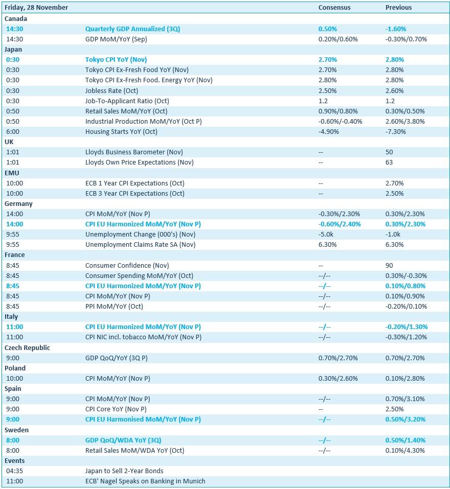 De Amerikaanse markten bleven gesloten voor Thanksgiving, dus de facto had niemand er gisteren echt zin in. Niettemin was het sentiment licht positief, en dat werd ondersteund door hoop op een staakt-het-vuren tussen Rusland en Oekraïne. Na drie winstdagen bleven Europese beurzen donderdag stabiel, zodat de Euro Stoxx 600 2% onder het recente record bleef hangen. Beleggers wachten nog steeds op een duidelijk signaal omtrent een Amerikaanse renteverlagingen in de VS.