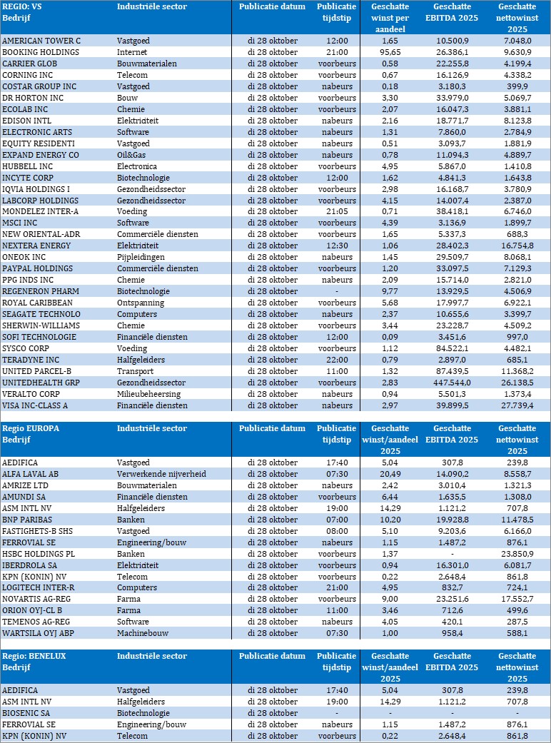 Qua bedrijfsresultaten mogen we ons deze week opmaken voor een totale lawine! Vandaag krijgen we onder meer inzicht in de derde kwartaal cijfers van American Tower, Booking, Corning, Costar, Dr Horton, Mondelez, MSCI, Nextera Energy, Paypal, Sofi Technology, Sysco, Teradyne, UPS, Aedifica, Amundi, ASMI, BNP Paribas, Iberdrola, Novartis, Biosenic, Ferrovial en KPN. Maar de lijst is veel langer dan dat, en dat zal de komende dagen niet minderen.