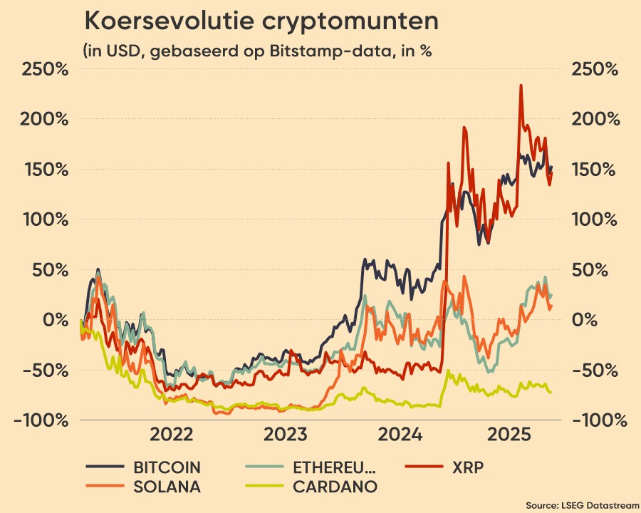 Extra zuurstof kwam er ook vanuit de goudmarkt, want het lijkt er op dat de “goudkevers” de recente winstreeks verzilveren (-1,1% tot 3.936 dollar) en die opbrengst recycleren in de kwaliteitsnamen op de aandelenmarkten. Van risk-off naar risk-on, heet dat dan, maar het kan even zo goed weer in geen tijd de andere richting opgaan. Dat dipje wordt niet doorgetrokken op de cryptomarkten, waar de bitcoin stabiliseerde op 114.251 dollar en Ethereum klom naar 4.194 dollar.