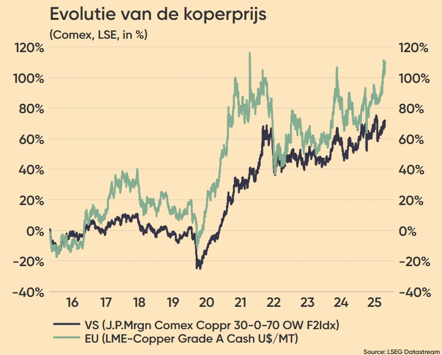 Haaks op de goudprijs staan de grondstoffen, die over het algemeen blijven stijgen, zelfs na 2,1% winst doorheen vorige week. Die hausse werd deels aangevoerd door een hogere olieprijs (vannacht -0,9% tot 64,4 dollar per Brent-vat) en een blijvende honger in metalen vanwege de vooruitzichten op een handelsakkoord. De koperprijs is daar een mooi voorbeeld van, met een prijs die hoger en hoger blijft evolueren.