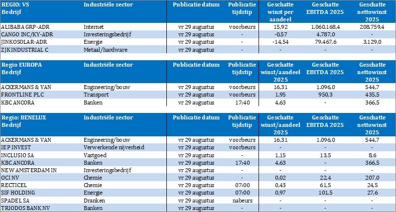 Bedrijfsresultaten krijgen we dan weer van Alibaba, Cango Jinko Solar, Zjk Industrial, Ackermans & van Haaren, Frontline, KBC Ancora, Iep Invest, Inclusio, KBC Ancora, New Amsterdam Invest, Oci, Recticel, Sif Holding, Spadel, en de Triodos Bank.