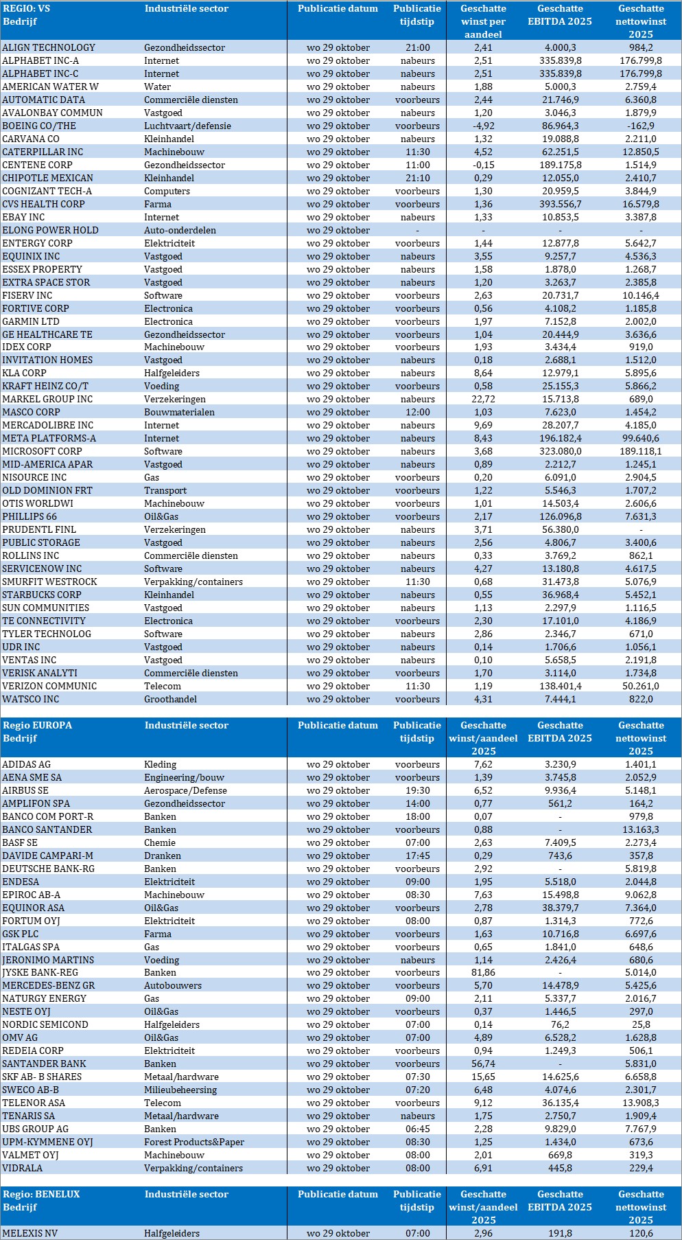 En dan zijn er bedrijfsresultaten, en echt héél veel daarvan. Op het menu staan onder meer Align Technology, Alphabet, American Water Works, Automatic Data, Avalon bay Communications, Boeing, Carvana, Caterpillar, Centene, Chipotle Mexican Grill, Cognizant, CVS Health, Ebay, Elong Power, Entergy, Equinix, Essex Property, Fiserv, Fortive, Garmin, GE Healthcare, KLA, Kraft Heinz, Markel, Masco, Mercadolibre, Meta Platforms, Microsoft, Old Dominion, Otis Worldwide, Phillips66, Prudential Financial, Public Storage, Servicenow, Smurfit Westrock, Starbucks, TE Connectivity, Tyler Technology, Verizon Communications, Adidas, Aena, Airbus, Amplifon, Banco Commercial Portugal, Banco Santander, -Basf, Davide Campari, Deutsche Bank, Endesa, Epiroc, Equinor, Fortum, GSK, Italgas, Jeronimo Martins, Jyske Bank, Mercedes Benz, Neste, Nordic Semiconductor, Omv, Santander, Skf, Sweco, Telenor, Tenaris, UBS UPM Kymmene en Melexis. En morgen? Minstens even veel van dat moois.