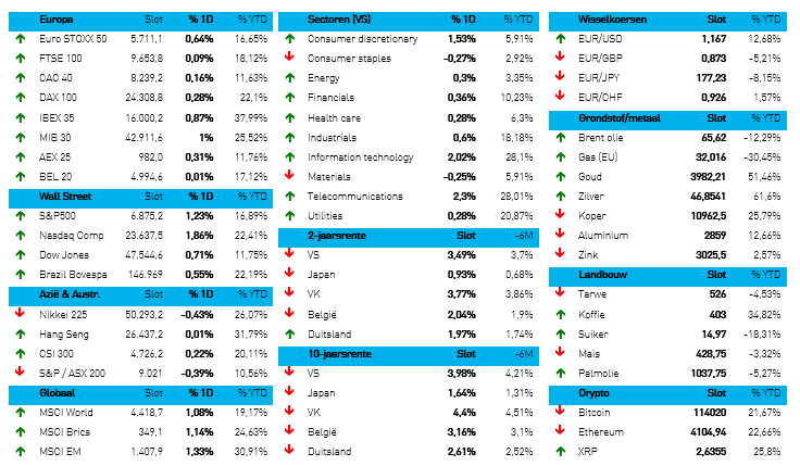 Op de grondstoffenmarkt was er eerder sprake van zwakte, want de prijs voor een vat Brent-olie daalde licht tot 63,75 dollar door twijfels over Russische sancties en OPEC+ productieverhogingen. Basismetalen zoals koper behielden hun terrein, terwijl de aardgasprijzen daalden door het ruime aanbod in de VS