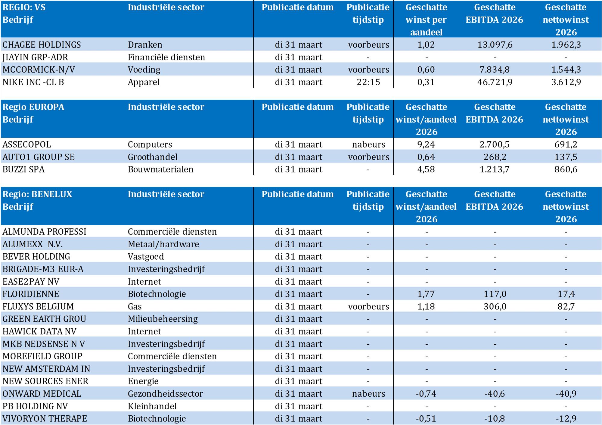 Bedrijfsresultaten komen er vandaag onder meer van Autoliv, Bever Holding, Brigade-M3 Europa, Chage Holdings, Ease2Pay, Floridienne, Fluxys Belgium, Green Earth Group, Havick Data, Jaiyin, McCormick, MKB Nedsense, New Amsterdam Invest, Nike, Onward Medical, VIB en Vivoryon Therapeutics.