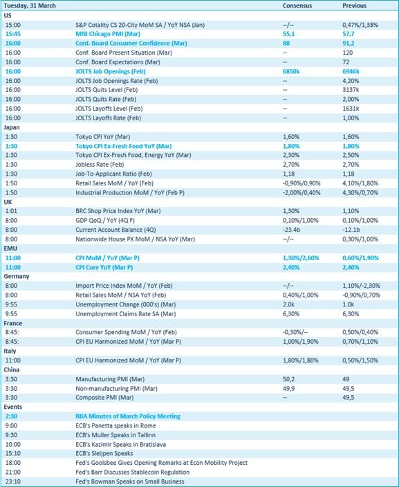 Er staan een pak inflatienieuws op het menu, met onder meer data uit Europa, Italië, Japan en België. Verder krijgen we inzicht in het Amerikaanse consumentenvertrouwen en het JOLTS- arbeidsmarktrapport, inclusief vacatures en ontslaggegevens. In Japan volgt een brede set inflatiecijfers, naast kleinhandelsdata, terwijl Duitsland updates geeft over invoerprijzen, detailhandel, werkloosheid en consumptie. Frankrijk levert dan weer werkloosheidsdata aan terwijl de Australische centrale bank de notulen vrijgeeft van zijn beleidsvergadering.