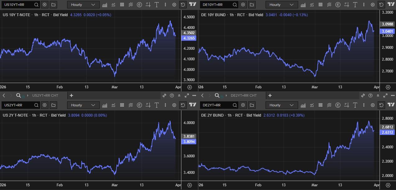 De reactie op de rentemarkten was een beetje anders dan in de eerdere stadia van het conflict. Beleggers krijgen immers meer en meer ook voor de neerwaartse groeirisico's, dan de opwaartse inflatierisico's. Daarom daalde de Amerikaanse rente gisteren tussen 8 en 5 basispunten op 2 en 10 jaar (tot 3,8% en 4,32%), voortbouwend op een neerwaarts momentum dat al op vrijdag begon. In de VS houdt Fed-topman Powell vast aan een scenario van een tijdelijke inflatieschok, zodat eventuele renteverhogingen uitgesloten zijn. Voorlopig tenminste. Ook de Duitse rente daalde gisteren 4 à 5 basispunten om af te klokken op 3,03% op 10 jaar en 2,62% op 2 jaar.