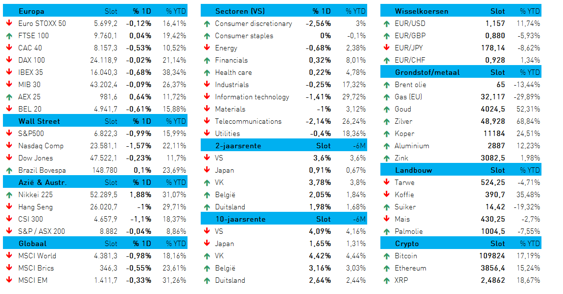 De goudprijs blijft flirten met de grens van $4.000 dollar per ounce, terwijl de Bitcoin even richting 106.500 dollar dook, om alsnog te herstellen tot 109.537 dollar. De prijs voor een Brent-olie daalde 0,3% naar 63,91 dollar per vat omdat ruime Amerikaanse voorraden de OPEC+-productieverminderingen compenseerden.