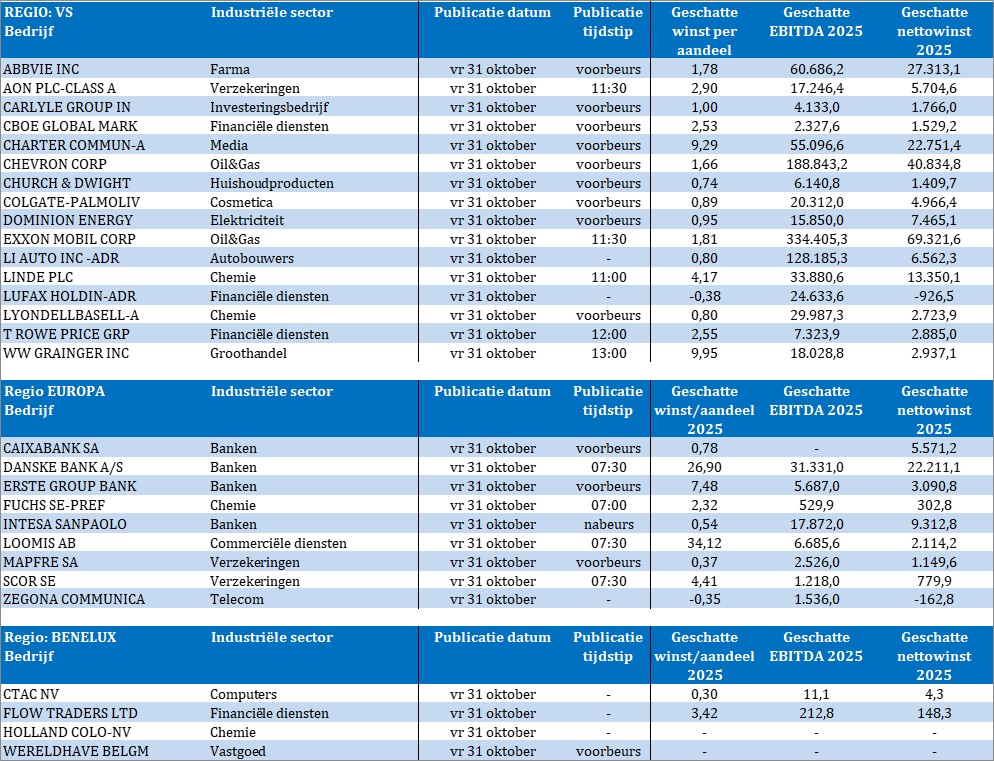 Bedrijfsresultaten komen er onder meer van Abbvie, Aon, Carlyle, CBOE Global Markets, Chevron, Colgate Palmolive, Dominion Energy, Exxon Mobil, Li Auto, Linde, Lyondell basell, T Rowe Price, Caixa bank, Danske Bank, Erste Bank, Fuchs, Intensa San Paolo, Scor, CTAC, Flow Traders, Holland Colours, Wereldhave Belgium en Fugro.
