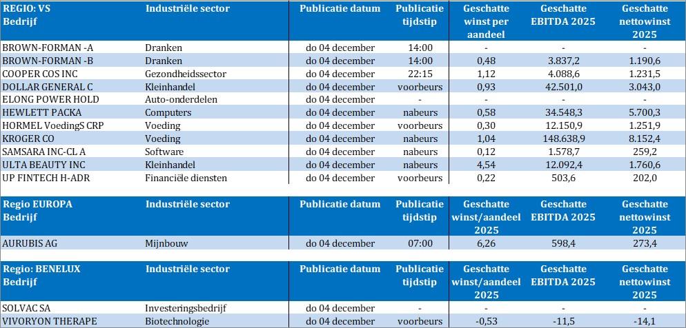 Bedrijfsresultaten worden dan weer aangeleverd door onder meer Aurubis, Brown-Forman, Cooper Companies, Dollar General, Elong Power Holdings, Hewlett Packard, Hormel Foods, Kroger, Samsara, Solvac, Ulta Beauty, Up Fintech en Vivoryon Therapeutics.