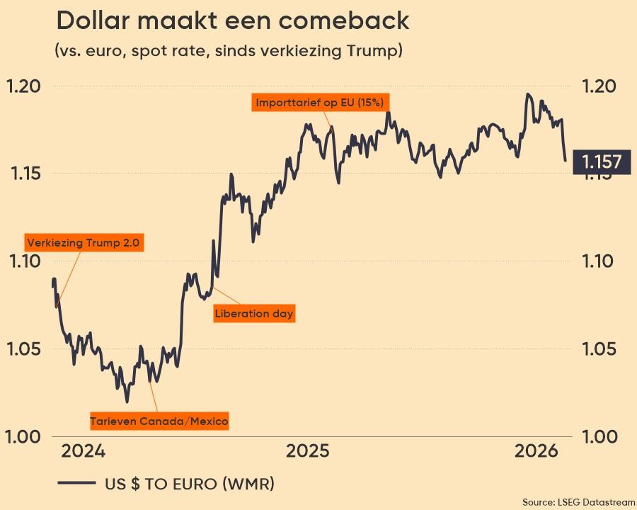 Haaks op het scenario van de ‘dedollarisatie’ (de infame “debasement trade”, weet u wel) is het opnieuw duidelijk dat de Amerikaanse dollar het in tijden van onzekerheid altijd goed blijft doen. De greenback klom gisteren opnieuw tot het peil van midden januari (€1 = $1,1615). De dollarindex, die de waarde van de dollar met de munten van de 6 belangrijkste handelspartners opvolgt, blijft schurkten tegen zijn hoogste peil in zes weken omdat beleggers munten mijden die het meest kwetsbaar zijn voor hogere energieprijzen.
