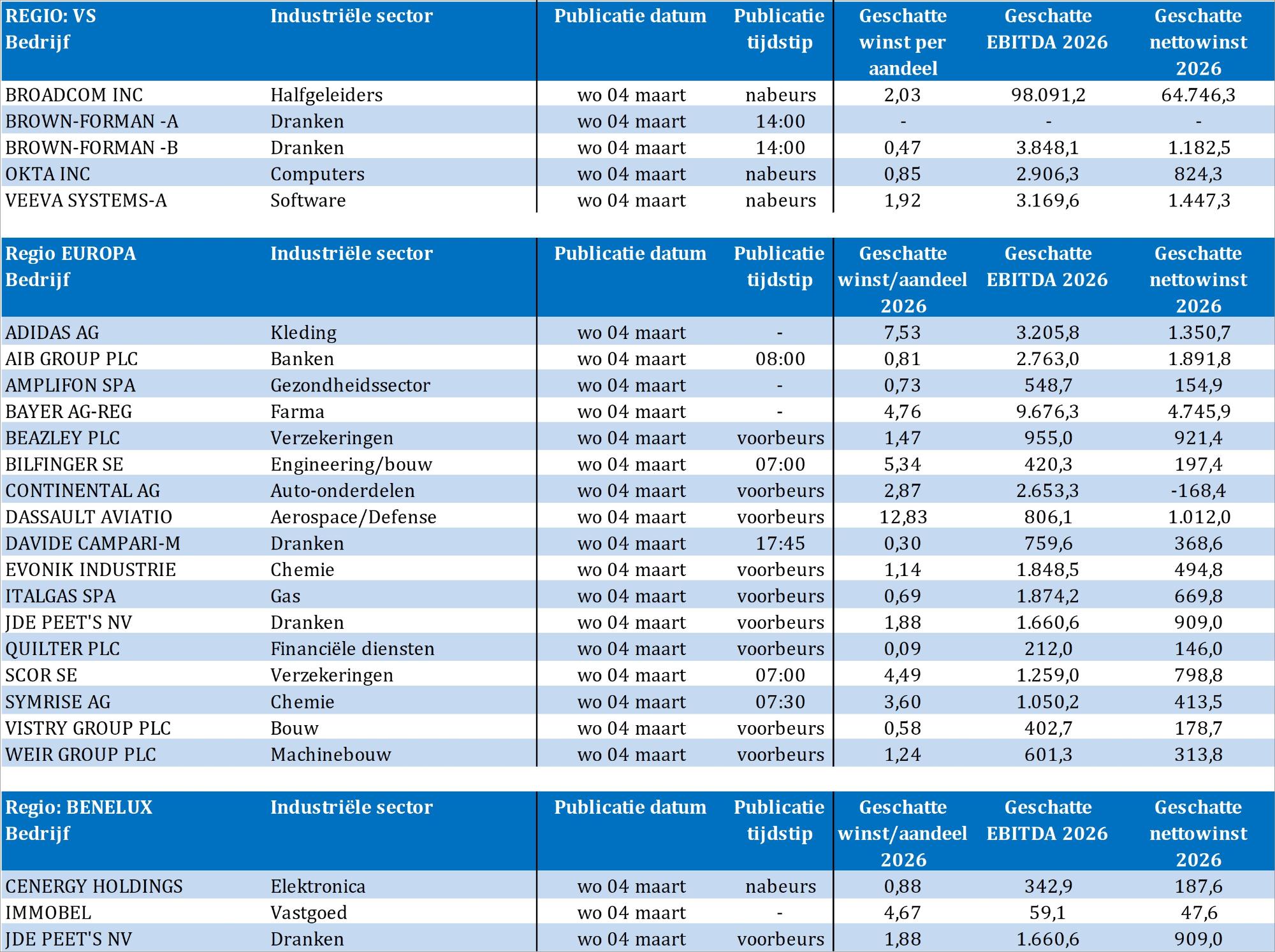 Bedrijfsresultaten komen er vandaag van onder meer van Adidas, AIB Group, Amplifon, Bayer, Bilfinger, Broadcom, Brown‑Forman Class A, Brown‑Forman Class B, Cenergy, Continental, Dassault Aviation, Davide Campari Milano, Evonik Industries, Immobel, JD Peet’s, Okta, Scor, Symrise en de Vistry Group.