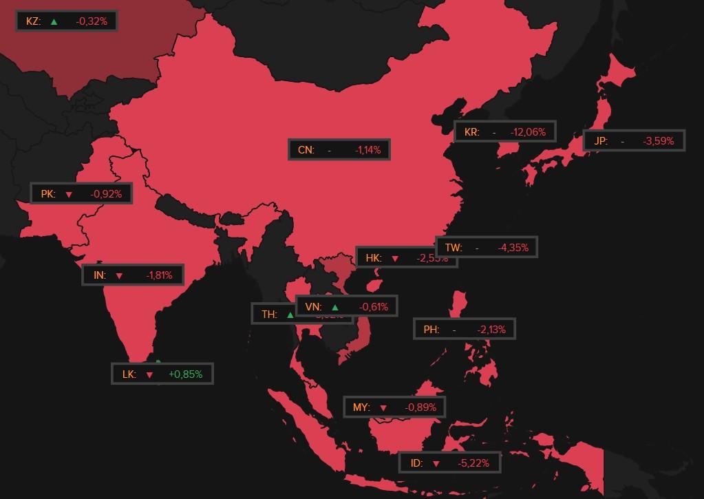 Voor de Euro Stoxx 600 (-3,1%) vertaalde zich dat in de slechtste dagprestatie sinds “Liberation Day” op 2 april 2025. Ook Wall Street incasseerde verlies, al herstelde de S&P500 het intradagverlies van 2,3% tot 0,94% bij de slotbel. De Dow verloor 0,83% en de Nasdaq 1%. Vannacht was er ook opnieuw nucleair alarm in het sterk door retailbeleggers gecontroleerde Zuid-Korea (-12%, nadat de circuit breakers in actie schoten en er gisteren ook al 10% verlies werd geïncasseerd). Ook Taiwan (-4,3%), Japan (-3,6%), Hongkong (-3,0%), India (-1,7%), en China (-1,3%) onder zware druk.