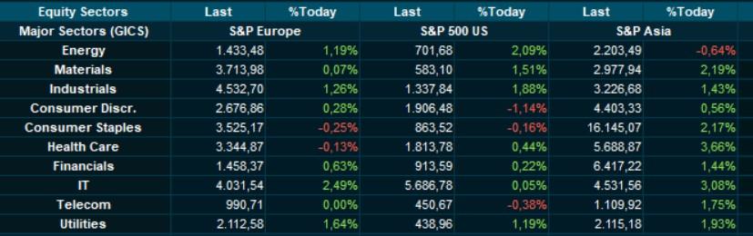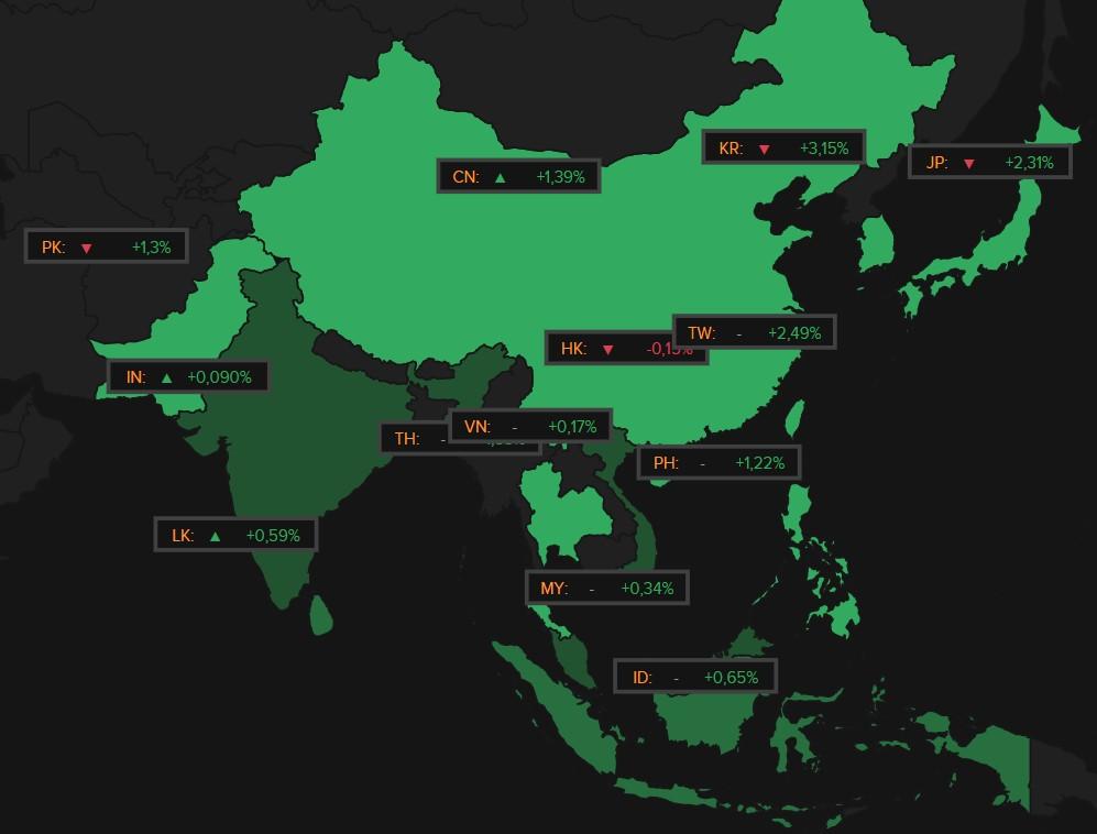 De Aziatische beurzen vierden vannacht wel dik feest. De sterkste stijgers zijn Zuid-Korea (+3,15%), Taiwan (+2,49%) en Japan (+2,31%), maar ook buiten Noordoost-Azië ging het hard: China (+1,39%), Pakistan (+1,3%) en de Filipijnen (+1,22%) gingen vol voor winst, terwijl Zuidoost-Azië het iets bescheidener hield: Indonesië (+0,65%), Maleisië (+0,34%), Vietnam (+0,17%) en Sri Lanka (+0,59%).