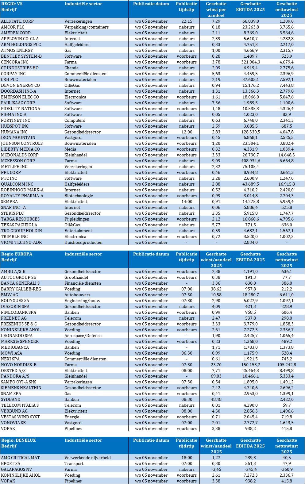 Bedrijfsresultaten zijn er weer bij de vleet, dus bijblijven is de boodschap. De klemtoon ligt deze keer in Europa, en voor inspiratie kan u onder meer terecht bij Allstate, Applovin, Arm Holdings, CF Cf Industries, Doordash, Emerson Electric, Fidelity National, Figma, Fortinet, Humana, Johnson Controls, Liberty Media, McDonalds, McKesson, Metlife, Qualcomm, Robinhood Markets, Snap, Trimble, Banca Generali, Barry Callebaut, BMW, Bouygues, Fresenius SE, Ahold Delhaize, Leonardo, Marks & Spencer, Mediobanca, Mowi, Nexi, Novo Nordisk, Orsted, Pandora, Siemens Healthineers, Vestas Wind, Vonovia, Vopak, AMG Critical Materials, Bpost, Galapagos of Vopak. Meer dan keuze genoeg, met andere woorden.