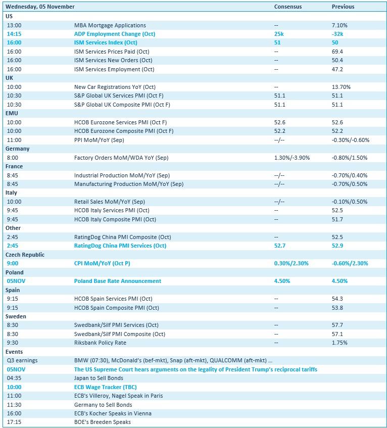 Op de economische kalender vinden we sentimentsindexen voor zowel de dienstensector als de geaggregeerde sector in de VS, de EU, het VK, Italië, China, Spanje en Zweden. In het VK verschijnen daarnaast de autoregistraties voor oktober. Voor de EU is er de inflatie op basis van de PPI (producentenprijzen) voor september. Duitsland publiceert de fabrieksorders van september, terwijl Frankrijk de industriële productie voor dezelfde maand bekendmaakt. De Poolse centrale bank neemt een rentebesluit en Tsjechië geeft inzicht in de consumenten inflatie over oktober.