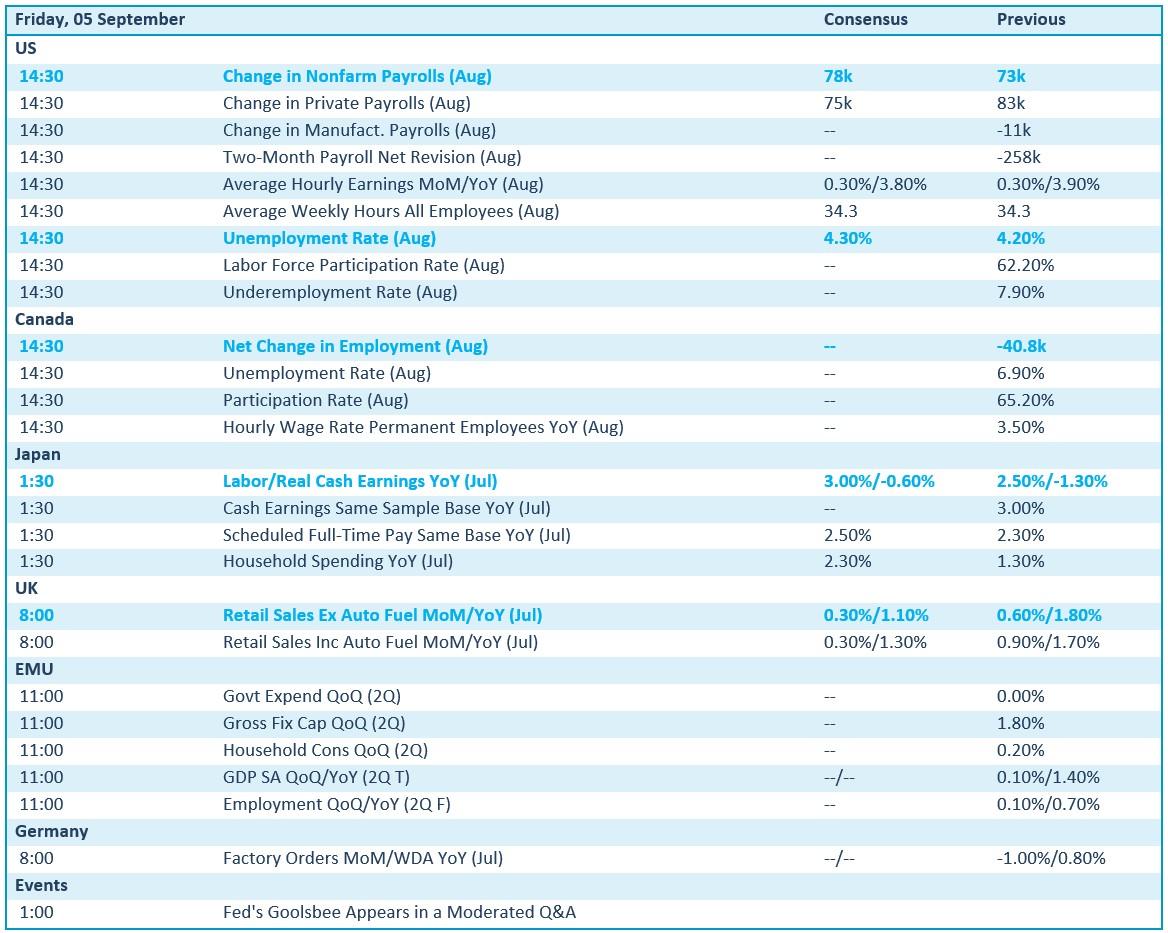 Het is vrijdag en dus worden we straks getrakteerd op het langverwachte Amerikaanse arbeidsmarktrapport. Dat moet mogelijk op een verdere verzwakking wijzen, wat de Fed een welgekomen excuus geeft om de rente later deze maand een eerste keer te verlagen. Het rapport geeft ook inzicht in de werkloosheidsgraad en de loonevolutie doorheen augustus. Verder kijken we nog naar de Japanse inkomens, de Britse kleinhandelsverkoop en het Europese BBP-cijfer, terwijl een update van de Duitse fabrieksbestellingen in juli meer dan gewoon interessant te zijn om in te schatten hoe het gesteld is met die verhoopte “Europese industriële revival”.