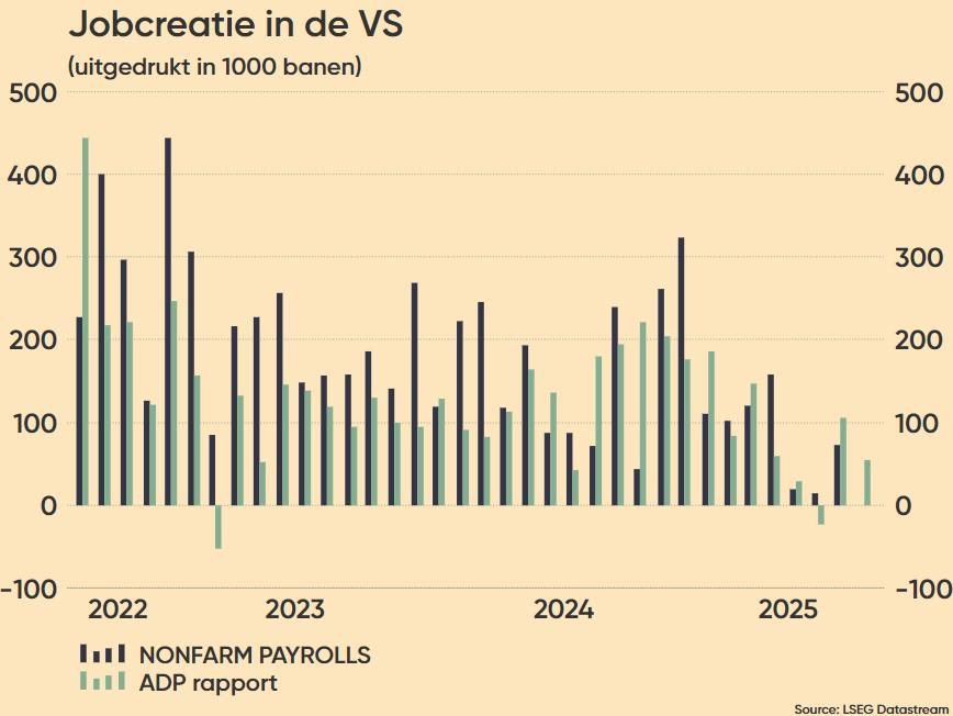 Dat herstel was opnieuw te wijten aan een herstel op de obligatiemarkten. Centraal in de beurshandel stonden immers voorlopige (ADP) cijfers over de Amerikaanse arbeidsmarkt; wat later vandaag moet uitmonden in het officiële arbeidsmarktrapport. Doorheen die data is ‘verzwakking’ het codewoord, wat wil zeggen dat de Fed binnen enkele weken quasi zeker de rente met (minstens) 25 basispunten zal verlagen. In totaal kunnen er in 2025 nog drie renteverlagingen volgen, wat wil zeggen dat de Amerikaanse rentecurve steiler kan worden.