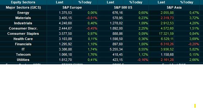 Zowel Europa (+0,6%) als Wall Street (+0,85%) bleven de appelflauwte van eerder deze week verteren. Ook het koersenbord in Azië laat een algemeen herstel zien, met 'slechts' 0,6% winst in Japan (ondanks lagere Amerikaanse tarieven op o.m. auto's). China en Hongkong trekken fluks 0,7% hoger, terwijl Taiwan 1% verdapperde. Op sectorniveau wordt de winst netjes verdeeld, met in Europa op kop financials (+1,1%), technologie (+1,7%), en telecom (+1,7%), terwijl consumentengoederen (-0,45%) en grondstoffen (-0,1%) aanmodderden. Op Wall Street hetzelfde beeld, met als uitzondering een sterk herstel voor de consumentengoederen (+2,4%) en industrials (+1,1%). Risk-on, zoveel is duidelijk.