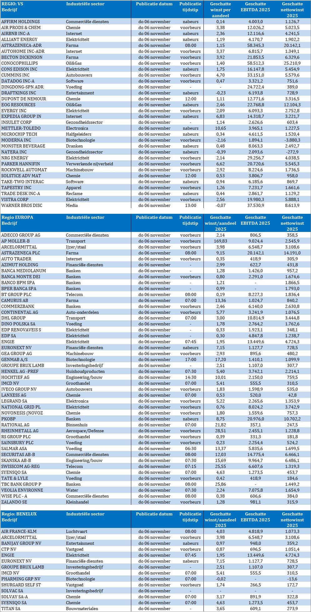 Ook vandaag weer staan er massa’s bedrijfsresultaten op het menu. Zo bijvoorbeeld kijken we over de schouders van Affirm Holdings, Airbnb, Astrazeneca, Autohome, ConocoPhillips, Cummins, Datadog, DraftKings, DuPont de Nemours, Expedia, Insulet, Moderna, Monster Beverage, Parker Hannifin, Rockwell Automation, Trade Desk, Adecco, ArcelorMittal, Astrazeneca, BT, Commerzbank, Continental, DHL, EDP, Engie, Euronext, GBL, Henkel, Hochtief, IMCD, Iveco, Lanxess, Legrand, Rheinmetall, Syensqo, Tate & Lyle, Wise, Zalando, Air France-KLM, CTP, Pharming, Shurgard, Solvac, Solvay, Titan en veel meer van dat moois.