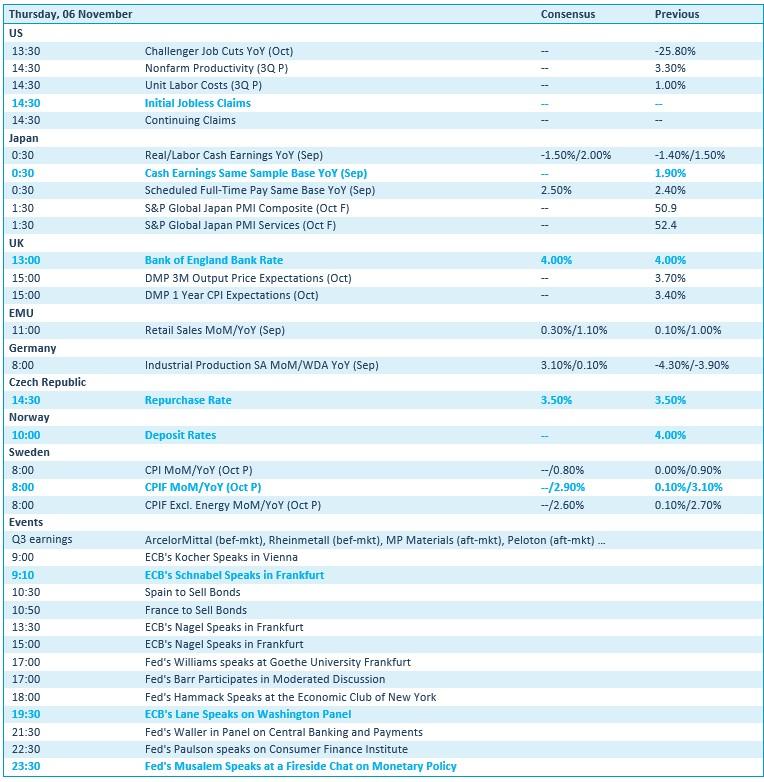 Op de economische kalender nemen de centrale banken een prominente plaats in. In het VK, Tsjechië en Noorwegen worden rentebesluiten verwacht, al lijkt het erop dat de rente overal ongewijzigd zal blijven. In Europa volgen we de kleinhandelsverkopen van september, die een indicatie geven van het consumentengedrag. Zweden publiceert zijn inflatiecijfers, wat belangrijk is voor het rentebeleid van de Riksbank. Tot slot spreekt Isabel Schnabel van de ECB deze week. Haar toespraak kan extra inzicht geven in het toekomstige monetaire beleid binnen de eurozone.