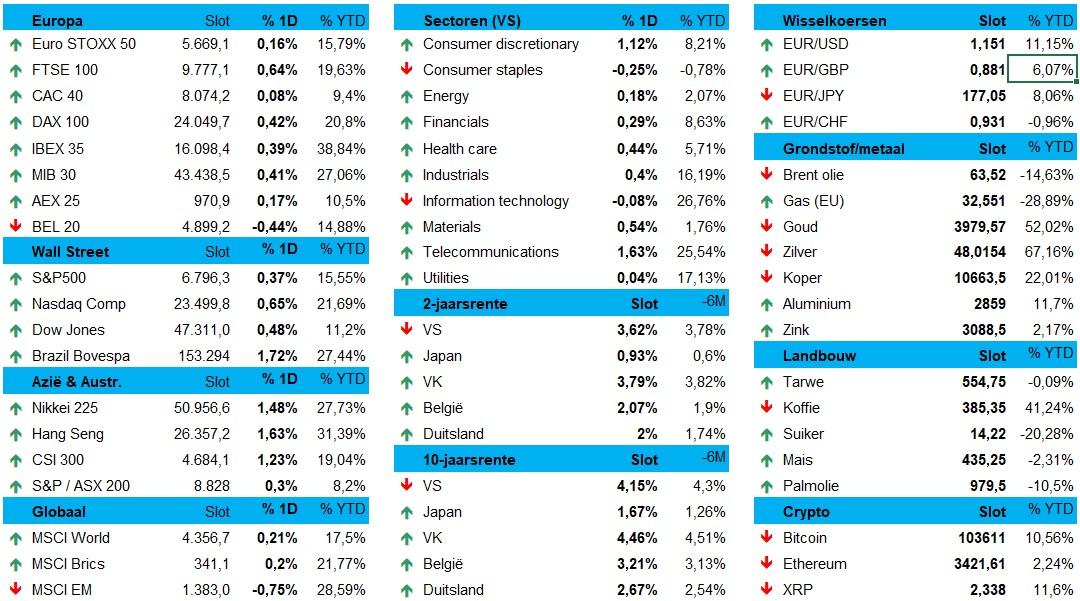 De goudprijs verdapperde ietwat tot 4.002 dollar per ounce, terwijl cryptomunten stabiliseerden. Voor een Bitcoin telt u 103.191 dollar neer, terwijl de grondstoffenprijzen wat onder druk bleven staan. De olieprijzen stegen 0,3% na een verrassende voorraadopbouw eergisteren van 5,2 miljoen vaten door de EIA.
