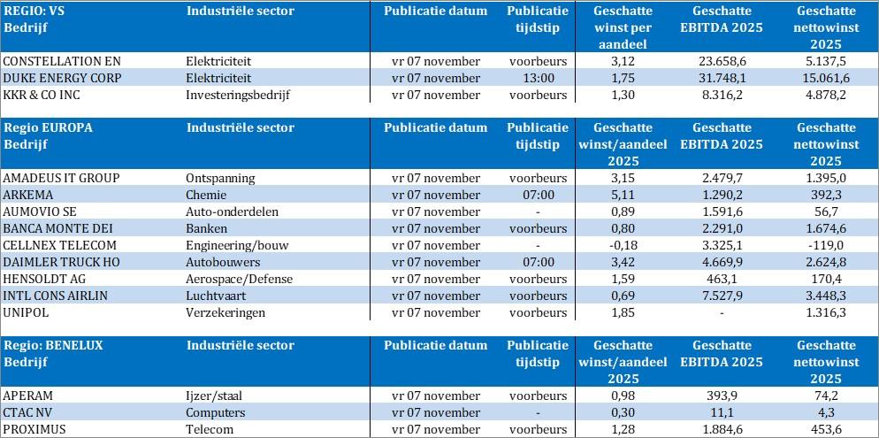 Ook zijn er weer een pak bedrijfsresultaten, waaronder Constellation Energy, Duke Energy, KKR & Co, Amadeus IT, Arkema, Aumovio SE, Banca Monte dei Paschi di Siena, Cellnex Telecom, Daimler Truck Holding, Hensoldt, Consolidated Airlines, Unipol, Aperam, Ctac en Proximus.