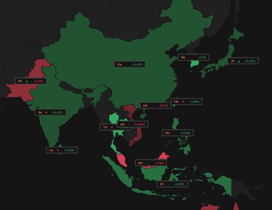 Ook Azië koerste vannacht fluks hoger, onder impuls van AI, tech en chips. Tot de winnaars behoorden onder meer Advantest (+2,6%), SoftBank (+2,8%) en Tokyo Electron (+1%). Ook Zuid-Korea (+2,7%), Taiwan (+1,8%) en China (+0,45%) deden het goed, maar niettemin verliest de HS Tech-index 1,1%. Ook een portie gemengd, met andere woorden.