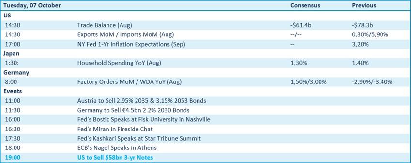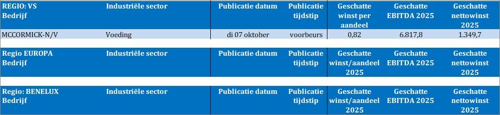 Op de economische kalender vinden we nogal wat nieuws, maar niets dat deining zou moeten veroorzaken op de markten. We kijken uit naar de publicatie van de notulen van de Fed-vergadering en het rentebesluit in Nieuw-Zeeland, terwijl er dichter bij huis Duitse cijfers over de industriële productie op het menu staan. Ook eisen de Zweedse inflatiecijfer over september wat aandacht op, net zoals de speech van Bank Of England topman Huw Pill. Dat alles wordt niet, of nauwelijks gecompenseerd door bedrijfsresultaten, want daar zorgt enkel McCormick voor.