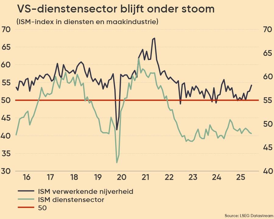 De Amerikaanse ISM Services PMI-index toonde gisteren nog maar eens aan dat er weinig sleet zit op de machine. In december steeg de index al voor de derde maand op rij tot 54,4 punten, ruim boven de verwachting van 52,3. De sterkste groei in de dienstensector sinds oktober 2024 is dus een feit, met alle subindices in expansiezone, terwijl de prijsdruk iets afnam en leveringstijden vertraagden.