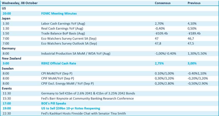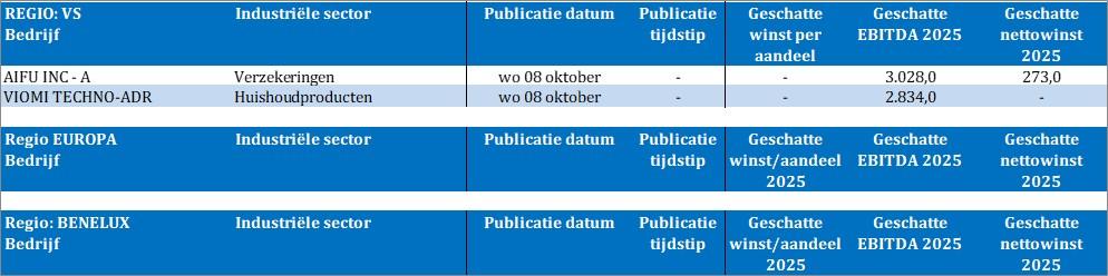Op de economische kalender vinden we nogal wat nieuws, maar niets dat deining zou moeten veroorzaken op de markten. We kijken uit naar de publicatie van de notulen van de Fed-vergadering en het rentebesluit in Nieuw-Zeeland, terwijl er dichter bij huis Duitse cijfers over de industriële productie op het menu staan. Ook eisen de Zweedse inflatiecijfer over september wat aandacht op, net zoals de speech van Bank Of England topman Huw Pill. Dat alles wordt niet, of nauwelijks gecompenseerd door bedrijfsresultaten. Op de rol staan Aifu en Viomi Technology, maar dat is het dan ook.